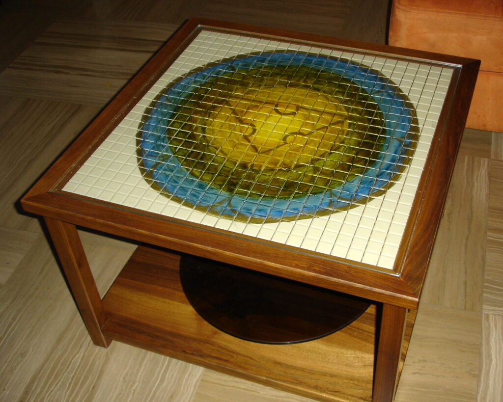 Tavolino da salotto cm. 75 x 75 x 48(h) in massello di Noce Nazionale, con mosaico porcellanato decorato a mano e vetro superiore antinfortunio.